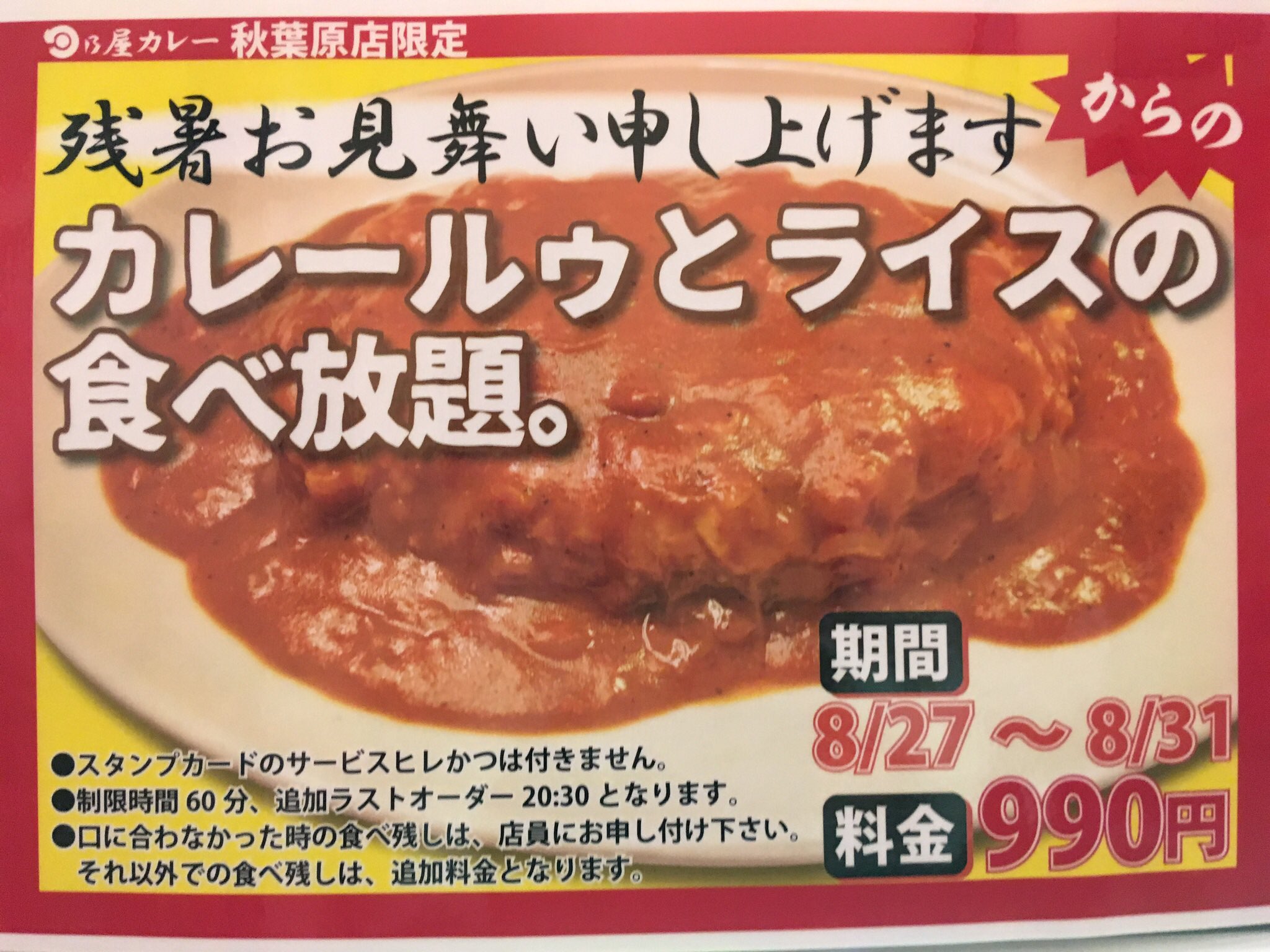日乃屋カレー秋葉原 On Twitter 食べ放題 やっちゃいます 秋葉原限定 期間限定 時間制限 60分 990円 お腹いっぱい お召し上がりくださいませ 日乃屋カレー秋葉原 拡散希望 カレー 期間限定 食べ放題 おかわり