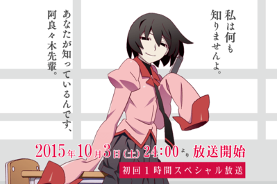 Tvアニメ 終物語 2015年10月3日 土 24 00より放送開始 08 05 衣装展 七夕展示 物語 フェス 衣装展 仙台会場にて開催. 2夜連続2時間スペシャル リピート放送は8 12 25 00 8 13 17 00.