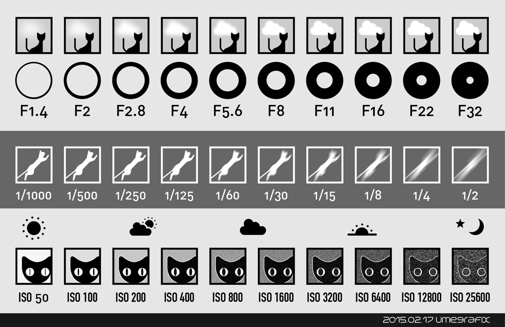 Umegrafix ウメグラ A Twitter 絞りシャッタースピード感度のビギナー向けチャート 感度のところに環境の明暗の要素を加えてみました 猫目の変化を使うことを思いついたので いっそ全部猫にしてみましたw 元チャートはこちら Https T Co Clq9byrw64 Http T Co